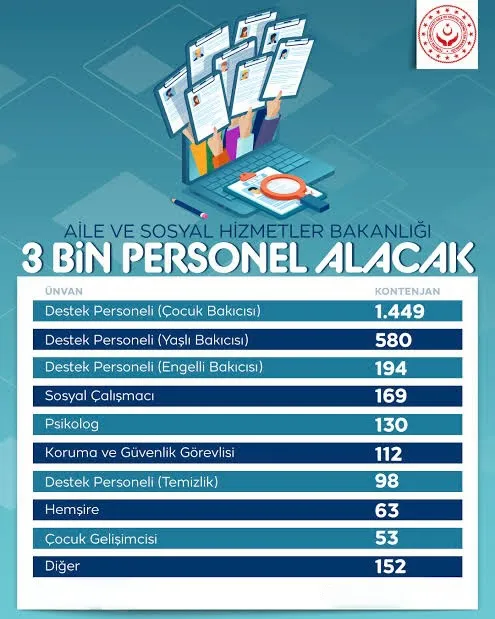 Aile ve Sosyal Hizmetler Bakanlığı bünyesinde istihdam edilmek üzere toplam 3 bin sözleşmeli personel alımı yapılacağı duyuruldu. Resmi Gazete’de yayımlanan ilana göre, başvuru süreci 15 Aralık 2025 – 26 Aralık 2025 tarihleri arasında gerçekleştirilecek.