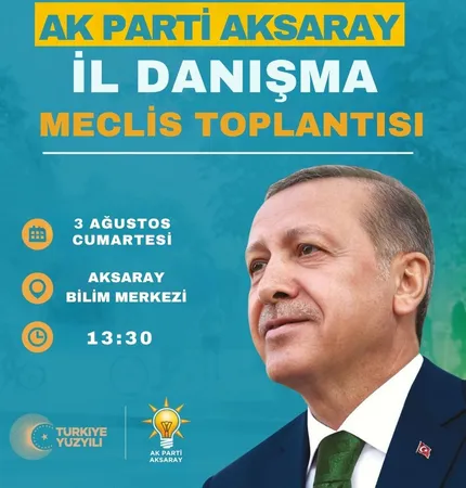 Saat 13.30'da başlayacak olan bu önemli toplantıda, AK Parti'nin Aksaray'daki yerel teşkilatları, parti üyeleri, ve yetkili isimler bir araya gelecek. Toplantının amacı, ildeki siyasi gelişmeleri, parti çalışmaları ve yerel projeleri değerlendirmek, aynı zamanda parti içi koordinasyonu ve uyumu güçlendirmektir.
