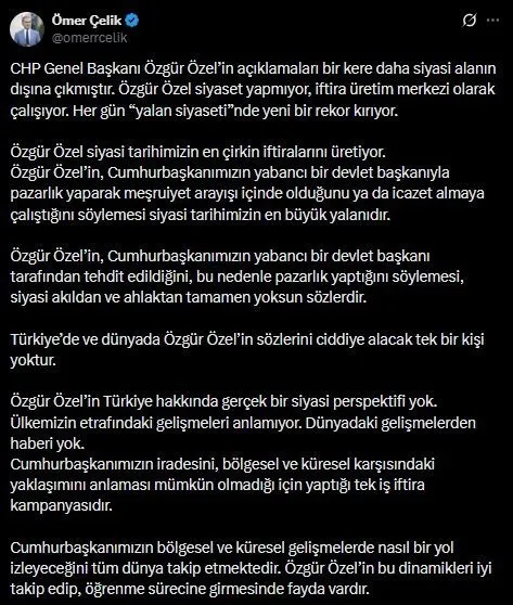 Ömer Çelik, Özgür Özel’in Cumhurbaşkanı'nın yabancı bir devlet başkanıyla pazarlık yaparak meşruiyet aradığı ya da icazet almaya çalıştığı yönündeki sözlerini, "siyasi tarihimizin en büyük yalanı" olarak nitelendirdi. Aynı şekilde, Cumhurbaşkanı'nın tehdit edildiği ve bu nedenle pazarlık yaptığı iddiasını da "siyasi akıldan ve ahlaktan tamamen yoksun sözler" olarak değerlendirdi.
