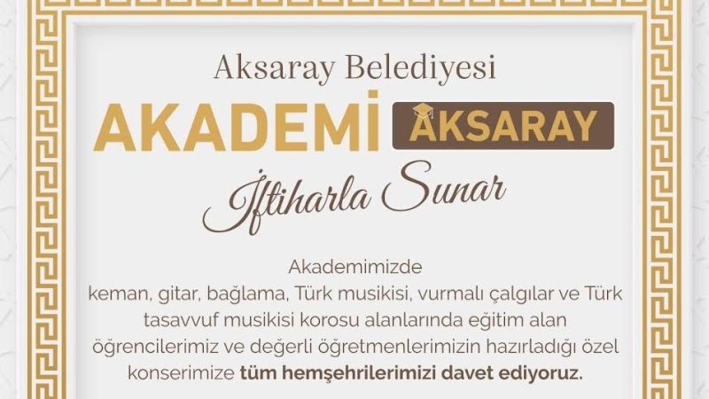 Akademi Aksaray'da keman, gitar, bağlama, vurmalı çalgılar, tasavvuf musikisi ve Türk musikisi gibi alanlarda eğitim alan öğrenciler, öğretmenleriyle birlikte hazırladıkları repertuvarı Aksaraylılara sunacak. Bu konser, hem öğrencilerin yıl içindeki gayretlerinin bir yansıması olacak hem de şehrin kültürel hayatına önemli bir katkı sağlayacak.