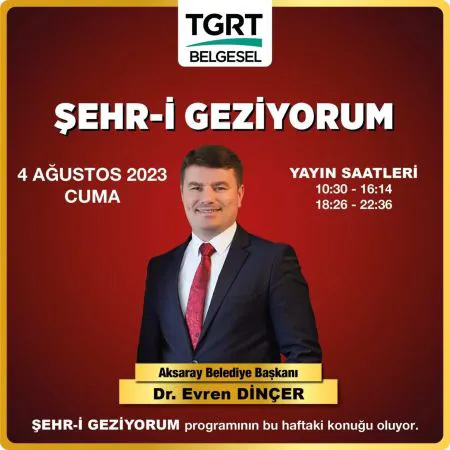 TGRT Belgesel kanalının sevilen programlarından biri olan Şehr-i Geziyorum’da bu haftanın konuğu Aksaray Belediye Başkanı Evren Dinçer oluyor. Başkan Dinçer’in konuk olacağı programda Aksaray’a dair merak edilenler yanıt buldu.