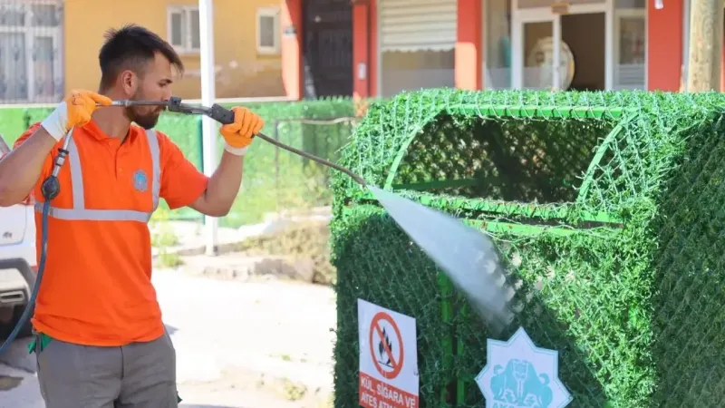 Konteynerlerin daha estetik bir görünüme kavuşması amacıyla yerleştirilen çimçitler, mahalle genelinde çevre düzenine katkı sağlarken, düzenli olarak yıkanarak temiz ve hijyenik kalmaları da sağlanıyor. Özel solüsyonlarla gerçekleştirilen temizlik işlemleri, kötü koku oluşumunun ve bakteri üremesinin önüne geçiyor.
