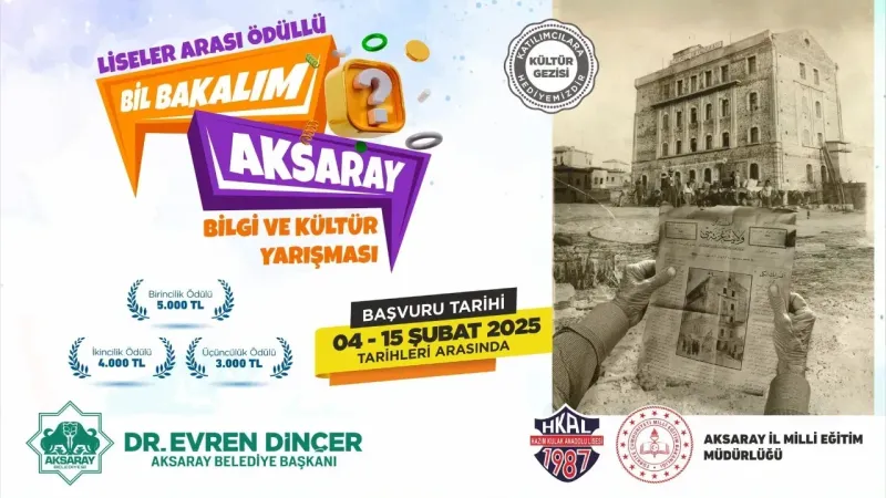 Aksaray Belediye Başkanı Dr. Evren Dinçer, yarışmanın gençlerin kültürel ve akademik gelişimine katkı sağlayacağını belirterek, “Gençlerimizin bilgi birikimini artırmak ve şehrimizin kültürel değerlerini daha yakından tanımalarını sağlamak adına bu yarışmayı düzenliyoruz. Bu organizasyon sayesinde öğrencilerimiz hem kıyasıya bir rekabetin içinde olacak hem de Aksaray’ın tarihi ve kültürel mirasını keşfedecekler. Tüm liseli gençlerimizi bu yarışmaya katılmaya davet ediyorum.” ifadelerini kullandı.