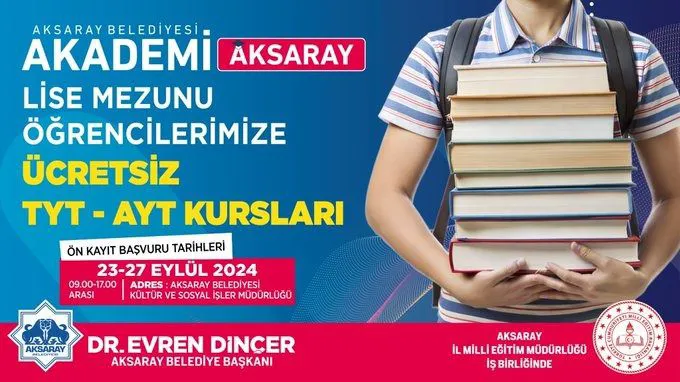 Ön kayıt başvuruları, 23-27 Eylül 2024 tarihleri arasında Aksaray Belediyesi Kültür ve Sosyal İşler Müdürlüğü'nde (Paşa Hamamı Yanı) yapılabilecek. Belediye yetkilileri, üniversite sınavlarına hazırlanan tüm öğrencileri bu önemli fırsattan yararlanmaya davet etti.
