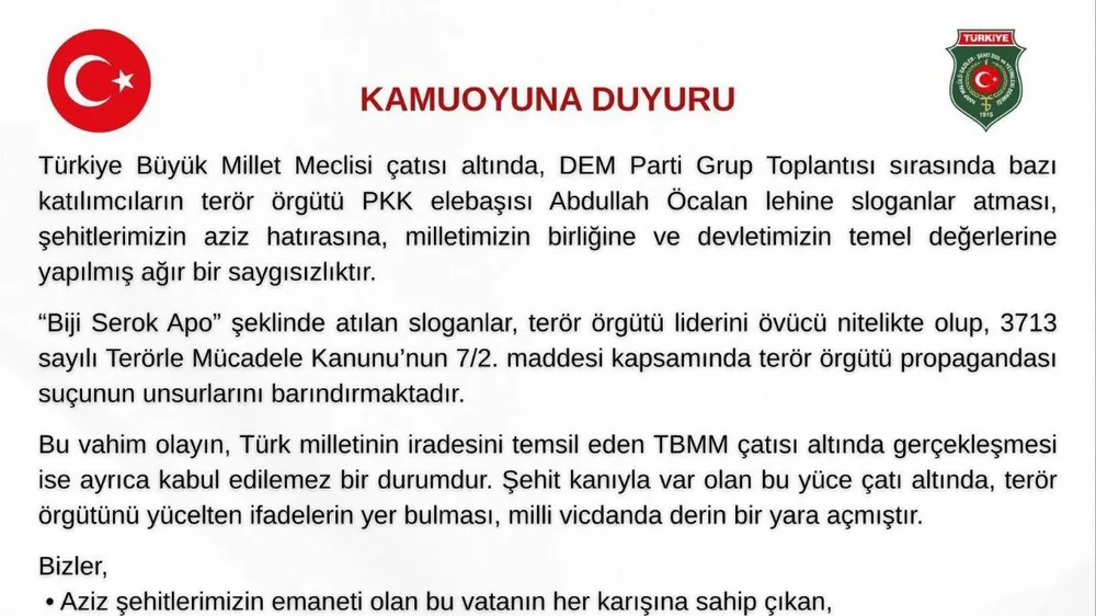 Aksaray Şehit Gazi Derneği, Türkiye Büyük Millet Meclisi’nde DEM Parti Grup Toplantısı sırasında terör örgütü lehine atılan sloganlara yönelik sert bir açıklama yaptı. Yapılan açıklamada, bu olayın şehitlerin hatırasına ve devletin temel değerlerine yapılmış büyük bir saygısızlık olduğu vurgulandı.