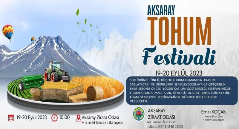 Aksaray Ziraat Odası Hizmet binası bahçesinde yapılacak olan tohum festivalinde sektöründe öncü tohum firmalarının ve kamu kurumlarının katlım sağlayacağı festivalde, ürünler sergilenerek ürünlerini tanıtma imkanı sağlanıyor. Aksaray Ziraat Odası Başkanı Koçak, çiftçilerin Ekim sezonu öncesinde yoğun katılım göstermesini hedefliyor.