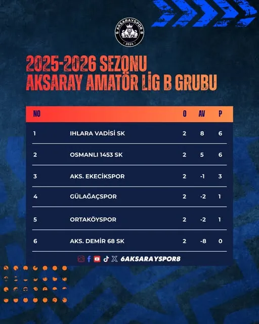 2025–2026 sezonu Aksaray Amatör Ligi B Grubu’nda ikinci hafta maçları tamamlandı. Heyecan dolu karşılaşmalar sonrası Ihlara Vadisi SK ve Osmanlı 1453 SK, ikide iki yaparak zirveye ortak oldu. Lig başından itibaren rekabet dozu yüksek bir sezon yaşanıyor.