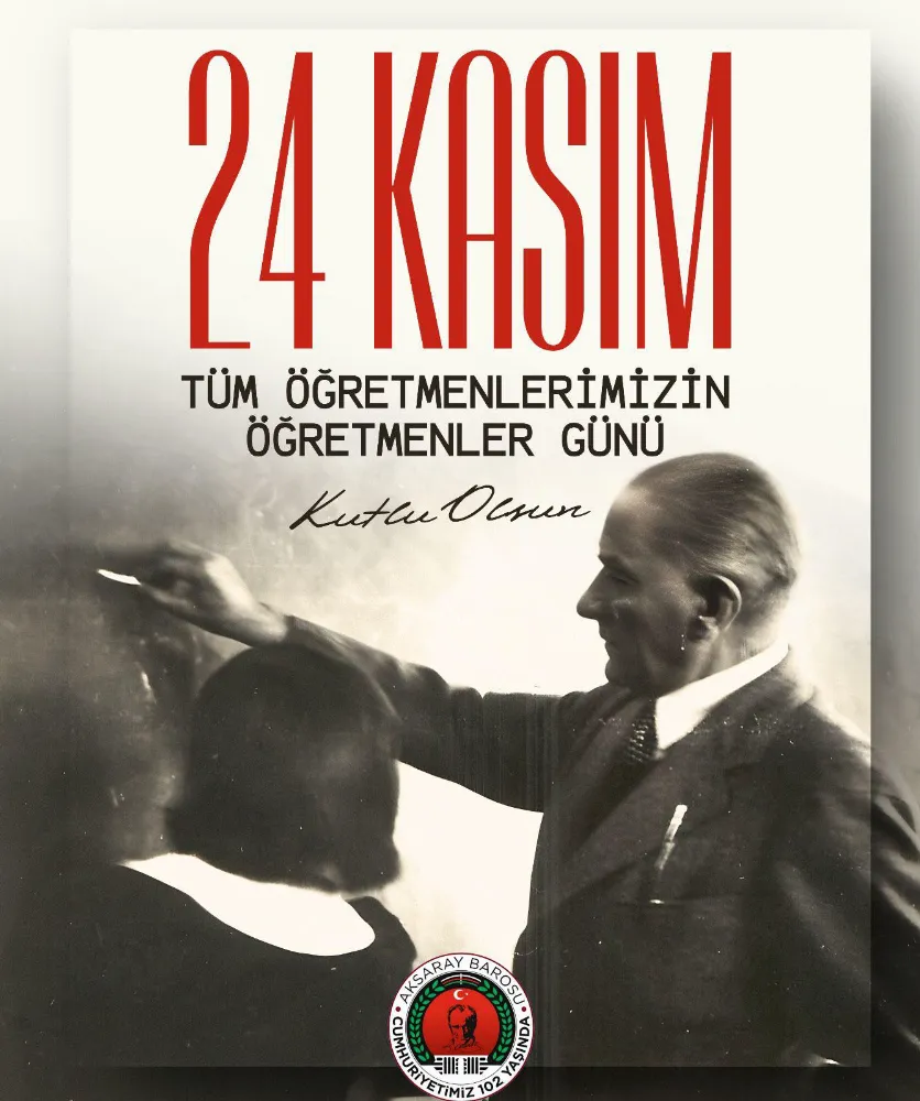 Aksaray Barosu, 24 Kasım Öğretmenler Günü dolayısıyla yayımladığı özel mesajla tüm öğretmenlerin gününü kutladı. Başöğretmen Mustafa Kemal Atatürk’ün öğretmenliğe verdiği önemi yansıtan görsel ile hazırlanan mesaj, büyük beğeni topladı.