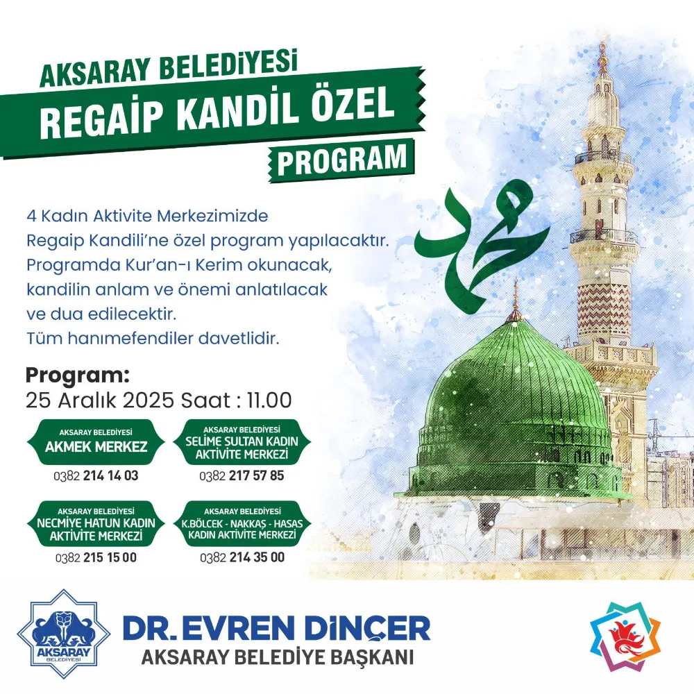 Regaip Kandili Özel Programı, 25 Aralık 2025 tarihinde saat 11.00’de başlayacak. Aksaray Belediyesi tarafından organize edilen etkinlik, kadınların bir araya gelerek bu özel günü idrak etmelerine imkân tanıyacak.