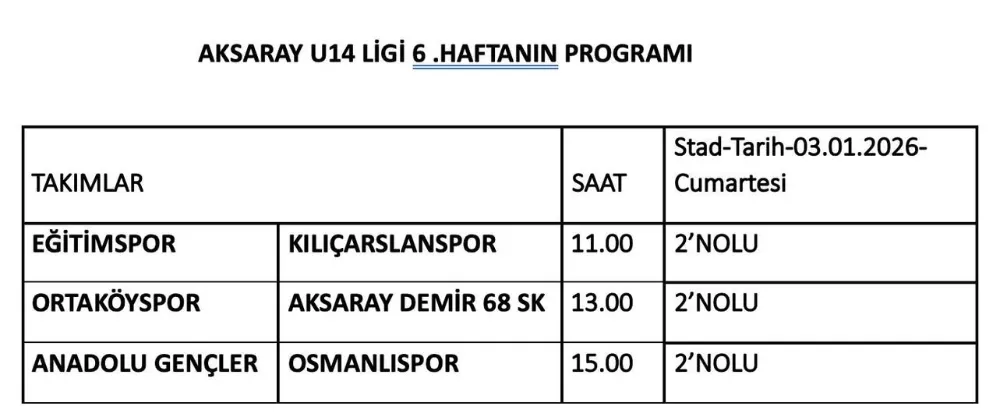 Aksaray Amatör Spor Kulüpleri Federasyonu koordinesinde düzenlenen U14 Ligi’nde 6. hafta müsabakaları, 3 Ocak 2026 Cumartesi günü oynanacak karşılaşmalarla devam edecek. Genç futbolcuların sergileyeceği performanslar, sporseverlere futbol dolu bir gün yaşatacak.