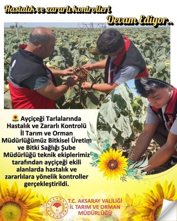 Aksaray İl Tarım ve Orman Müdürlüğü Bitkisel Üretim ve Bitki Sağlığı Şube Müdürlüğü teknik ekipleri, ayçiçeği ekili alanlarda hastalık ve zararlılara yönelik denetimlerine devam ediyor. Bu kapsamda il genelindeki birçok üretim alanı ziyaret edilerek kapsamlı kontroller gerçekleştirildi.