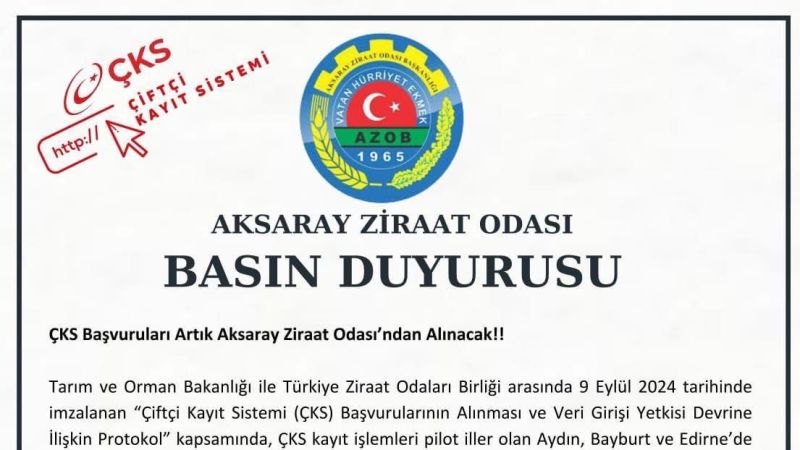 Bu önemli adım, 1 Eylül 2025 tarihi itibarıyla Aksaray’da da uygulanmaya başlayacak. Böylece Aksaraylı çiftçiler, ÇKS başvurularını doğrudan Aksaray Ziraat Odası üzerinden yapabilecek.