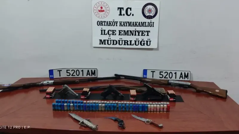 Operasyon Aksaray’ın Ortaköy ilçesinde bir ikamete yönelik gerçekleştirildi. Edinilen bilgiye göre, Ortaköy İlçe Emniyet Müdürlüğü ekipleri şüphe üzerine C.D. (32) isimli şahsı durdurarak sorgudan geçirdi. Şahsın resmi belgede sahtecilik ve 6136 SKM ve suç eşyasının satın alınması veya kabul edilmesi suçlarından işlem yapılan şahsın evinde Ortaköy Cumhuriyet Başsavcılığınca arama yapıldı. İkamette ve müştemilatında yapılan aramada 2 adet change olduğu değerlendirilen otomobil, 1 adet çalıntı olduğu tespit edilen motosiklet, 2 adet ruhsatsız tabanca, 1 adet kuru sıkı tabanca, 3 adet av tüfeği ve 177 adet tabanca fişeği ele geçirildi.