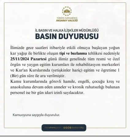 Aksaray'da dün akşam saatlerinde başlayan ve bugün sabaha kadar etkisini sürdüren kar yağışı nedeniyle tipi ve buzlanma riskine karşılık eğitim öğretime 1 gün süreyle ara verildi. Aksaray Valiliğinden yapılan yazılı açıklamada, “İlimizde gece saatleri itibari ile etkili olmaya başlayan yoğun kar yağışı ile birlikte oluşan tipi ve buzlanma tehlikesi nedeniyle 25.11.2024 Pazartesi günü ilimiz genelinde tüm resmi ve özel örgün ve yaygın eğitim kurumları ile rehabilitasyon merkezleri ve Kuran kurslarında (yetişkinler hariç) eğitim ve öğretime 1 gün süreyle ara verilmiştir. Kamu kurumlarında görevli hamile engelli, çocuğu kreş ve anaokulunda devam eden anneler ve kronik rahatsızlığı bulunan personel ise bir gün idari izinli sayılacaktır” denildi.