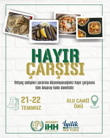 Hayır Çarşısı, hayırsever vatandaşların katkılarıyla toplanan gıda, giyim, ev eşyası, el emeği ürünler ve çeşitli ihtiyaç malzemelerinin uygun bedellerle sunulacağı bir organizasyon olarak dikkat çekiyor. Elde edilecek tüm gelir, Aksaray’daki ihtiyaç sahiplerinin desteklenmesinde kullanılacak. Bu anlamlı çarşıda yapılacak her alışveriş, bir başka hayatın daha kolaylaşmasına vesile olacak.