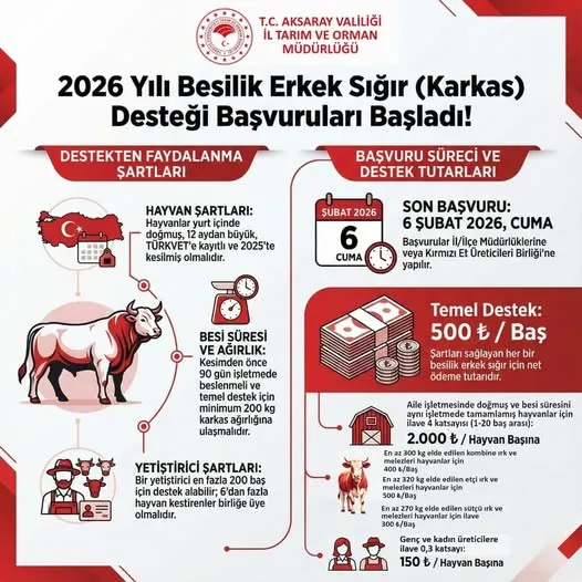 Aksaray İl Tarım ve Orman Müdürlüğü, 2026 yılı Besilik Erkek Sığır (Karkas) Desteği için başvuru sürecinin başladığını duyurdu. Bu destekle, hayvancılıkla uğraşan üreticilerin ekonomik olarak desteklenmesi ve sektördeki sürdürülebilirliğin artırılması hedefleniyor. Başvurular, İl ve İlçe Tarım ve Orman Müdürlükleri üzerinden kabul edilecek.