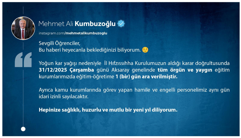 Kararı duyuran Aksaray Valisi Mehmet Ali Kumbuzoğlu, sosyal medya hesabından yaptığı paylaşımda, “Bu haberi heyecanla beklediğinizi biliyorum” ifadelerine yer vererek öğrencilere yeni yıl için sağlık, huzur ve mutluluk dileklerini iletti.