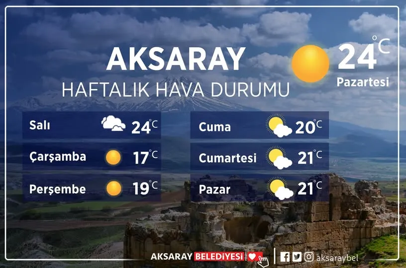 Aksaray’da yeni haftaya güneşli ve sıcak bir hava ile başlandı. Hava sıcaklığı yaklaşık 24 °C olarak ölçüldü. Güneşli havayı değerlendirmek isteyen vatandaşlar park ve açık alanlara yöneldi.