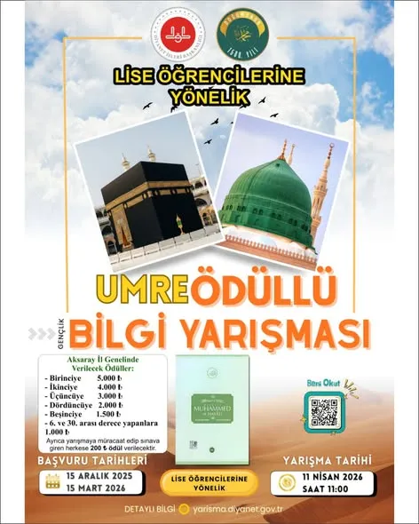 Diyanet İşleri Başkanlığı’nın ülke genelinde düzenlediği “Umre Ödüllü Gençlik Bilgi Yarışması” kapsamında, Aksaray İl Müftülüğü gençleri hem manevi hem de maddi olarak teşvik ediyor. Gençlerin dini bilgi düzeyini artırmayı amaçlayan yarışmaya Aksaray’dan yoğun katılım sağlandı.