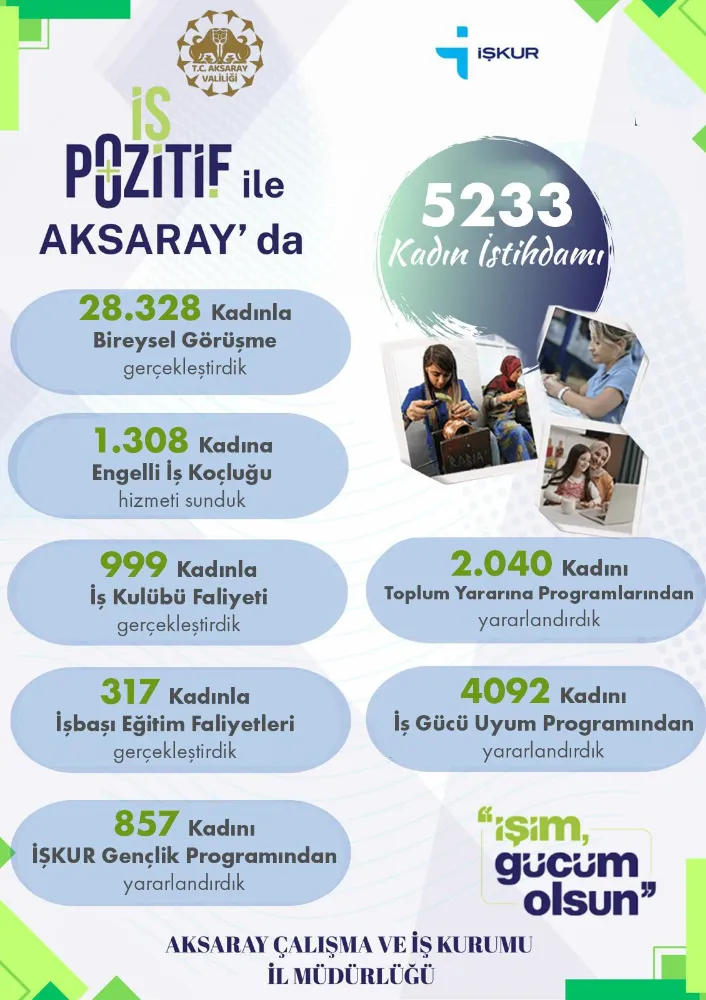 2024-2025 verilerine göre; Aksaray'da 28.328 kadına bireysel danışmanlık hizmeti verilirken, 1.308 engelli kadın Engelli İş Koçluğu’ndan faydalandı. 999 kadın İş Kulübü eğitimlerine katıldı, 5.233 kadın ise doğrudan istihdama kazandırıldı. 317 kadın işbaşı eğitimi ile tecrübe edinirken, 2.040 kadın Toplum Yararına Programlarla iş hayatına adım attı. İşgücü Uyum Programı sayesinde 4.092 kadın, Gençlik Programı ile 857 genç kadın ve Nitelikli İşgücü Yetiştirme Programı ile 30 kadın özel sektöre yönlendirildi. KİPAP kapsamında ise 42 kadın desteklendi. Toplamda 12.611 kadın aktif işgücü programları aracılığıyla iş sahibi oldu.