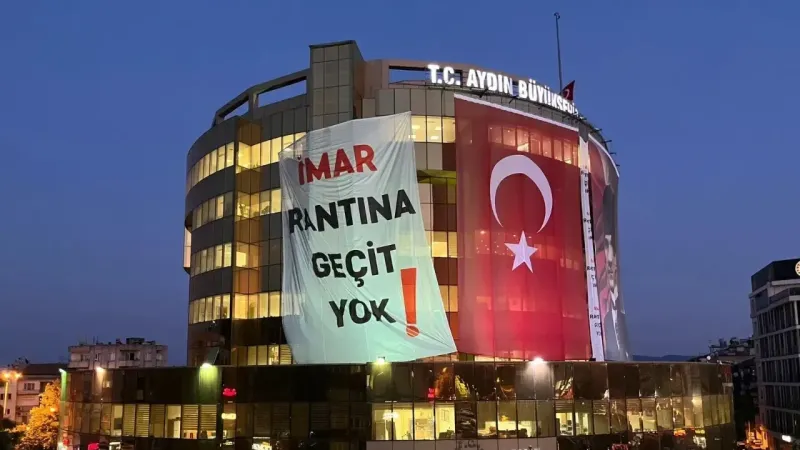 CHP’den AK Parti’ye geçen Aydın Büyükşehir Belediye Başkanı Özlem Çerçioğlu’na tepki olarak, belediye binasına “İmar rantına geçit yok” yazılı dev bir pankart asıldı. Pankart, CHP Genel Başkanı Özgür Özel’in Aydın’da düzenlediği miting öncesinde dikkat çekti.