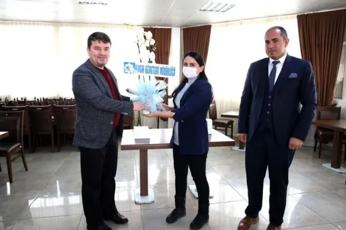 Belediye Başkanı Evren Dinçer’e çiçek takdiminde bulundular.
