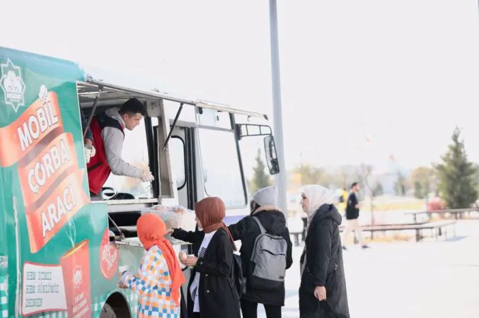 Bu anlamlı hizmetten faydalanan üniversite öğrencileri mobil çorba aracından ikram edilen çorba ve