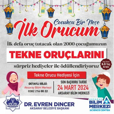 Çocukların gelenek ve görenekleri tanıyarak yetişmesi için birçok etkinliğe ev sahipliği yapan Aksaray Belediyesi Ramazan ayında ilk defa oruç tutacak olan çocukların Tekne Oruçlarını ödüllendirecek. Tekne orucu tutan çocuklara yönelik verilecek ödüllerle ilgili bilgilendirmeler 0382 216 00 22 numaraları telefonlardan ve Aksaray Bilim Merkezinden yapılıyor. Aksaray Belediyesine ait resmi sosyal medya hesaplarında bulunan formları dolduran çocuklar hediye almaya hak kazanabilecek. Toplamda 2 Bin çocuğun ödüllendirileceği etkinlik için son başvuru tarihi 24.03.2023 tarihi olarak belirlendi.