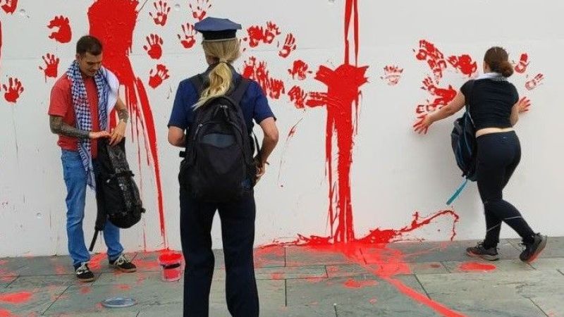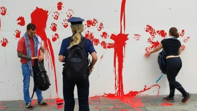 “Neue Generation” (Yeni Nesil) adlı grubun üyeleri olan iki gösterici, öğle saatlerinde ellerini kırmızı boyaya batırarak Almanya Başbakanlığı binasının dış cephesine sürdü. Aktivistlerden biri, elinde “Kirli iş kanlıdır” yazılı pankart tutarken, diğer aktivist Gazze’deki sivil kayıplara dikkat çekti.