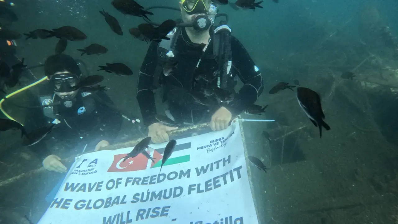 Bursa’nın Gemlik ilçesi açıklarında düzenlenen özel bir etkinlikte, şehit ve gazi yakınları denizin dibinde Filistin bayrağı açarak Gazze halkına destek mesajı verdi. Etkinlik, “Ortak akıl, ileri Türkiye” sloganıyla Anahtar Parti Bursa İl Başkanlığı öncülüğünde gerçekleştirildi.