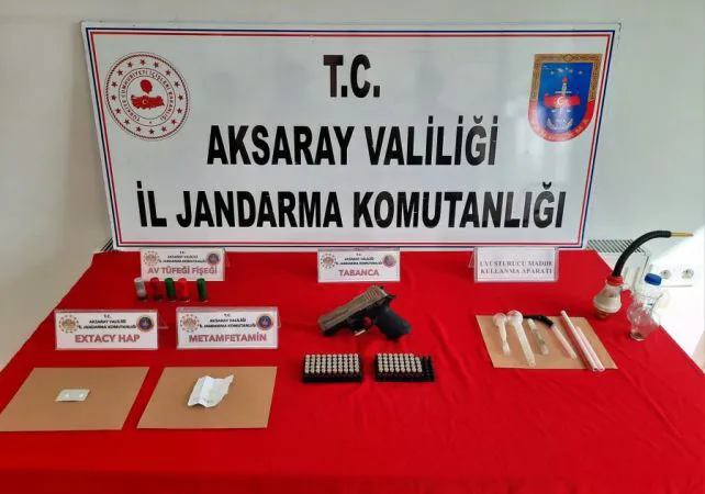 Aksaray Cumhuriyet Başsavcılığının talimatları doğrultusunda, Aksaray İl Jandarma Komutanlığına bağlı JASAT ve Asayiş Timlerince yapılan istihbari çalışmalar sonucunda, Uyuşturucu Madde Kullandığı ve Bulundurduğu tespit edilen bir şahsın üzerinde ve aracında yapılan aramada; (3) gram metamfetamin, (5) adet uyuşturucu veya uyarıcı madde kullanma aparatı, (1) adet 7.65 mm çapında ruhsatsız tabanca, (98) adet 7.65 mm tabanca fişeği, (5) adet av tüfeği fişeği, (2) adet psikotrop hap ele geçirildi. Ele geçirilen malzemelere el konularak, şüpheli şahıs hakkında gerekli adli işlemlere başlandı.