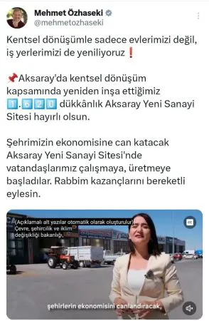 Özhaseki, paylaşımında, “Kentsel dönüşümle sadece evlerimizi değil, iş yerlerimizi de yeniliyoruz. Aksaray'da kentsel dönüşüm kapsamında yeniden inşa ettiğimiz Bin 620 dükkânlık Aksaray Yeni Sanayi Sitesi hayırlı olsun. Şehrimizin ekonomisine can katacak Aksaray Yeni Sanayi Sitesi'nde vatandaşlarımız çalışmaya, üretmeye başladılar. Rabbim kazançlarını bereketli eylesin” ifadelerine yer verdi.
