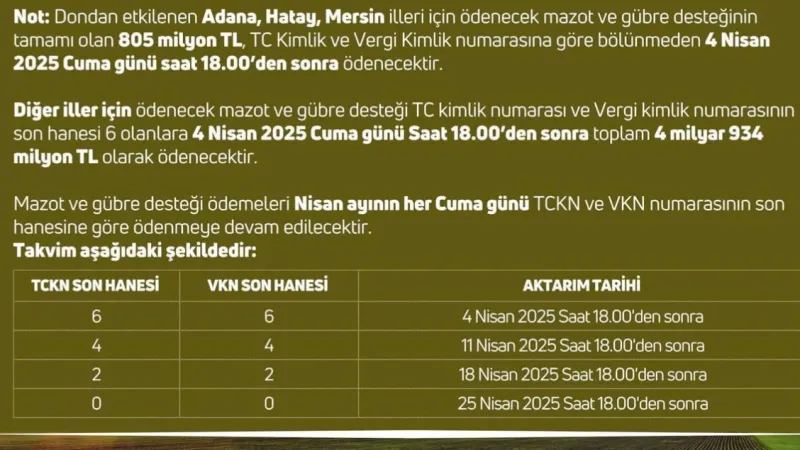 Not: Dondan etkilenen Adana, Hatay ve Mersin illeri için ödenecek mazot ve gübre desteğinin tamamı olan 805 milyon TL, TC Kimlik ve Vergi Kimlik numarasına göre bölünmeden, 4 Nisan 2025 Cuma günü saat 18.00’den sonra ödenecektir.