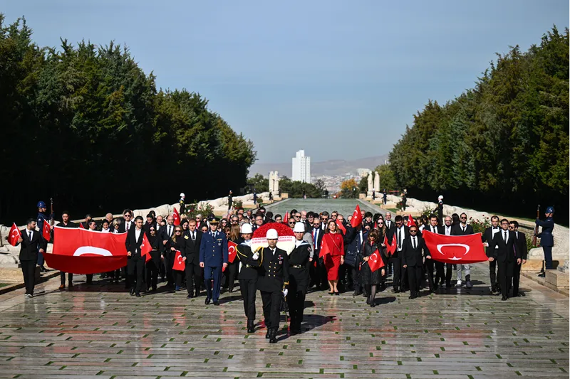 Aslanlı Yol'dan yürüyerek Büyük Önder Gazi Mustafa Kemal Atatürk'ün mozolesine gelen heyet, Sibel Ayhan Bayer'in çelenk bırakmasının ardından saygı duruşunda bulundu.