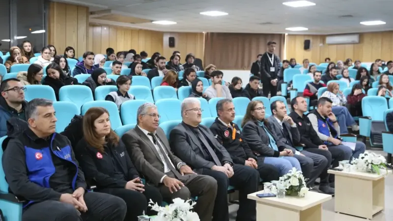 Depremlere karşı her zaman hazırlıklı olunması gerektiğinin altını çizen AFAD İl Müdürü Çelik, “Binalarımızı sağlam bir şekilde yapmaktan başka şansımız yok. Uygun zeminli yerlere binalar inşa etmeliyiz. Kentsel dönüşüm çalışmaları hızlandırılmalı, sağlam olmayan eski binalar yıkılmalı. Cumhurbaşkanımızın da dediği gibi yatay mimariye çok önem vermemiz gerekiyor. Çok katlı binalardan vazgeçmeliyiz. Önlemleri hep birlikte almalıyız” diye konuştu. Üniversite öğrencilerine AFAD gönüllüsü olma çağrısında bulunan Çelik, şunları söyledi: “Aksaray’da temel destek AFAD gönüllümüz 486’ya ulaştı. AFAD gönüllülerimizin sayısı sürekli artıyor. 100 binden fazla AFAD gönüllümüz var. Gücünüzün farkında olmanız gerekiyor. Deprem anında bir kişinin bile ne kadar önemli olduğunu gördük. Allah bir daha yaşatmasın ama sizlerin gücüne her zaman ihtiyacımız var. Çadır kurmaktan tutun, psikolojik desteğe kadar her alanda sizin gücünüze ihtiyacımız var. Lütfen AFAD gönüllüsü olun. Sayınız arttığı sürece hiçbir şeyden korkumuz yok. Sizleri AFAD’ın arasında görmek istiyoruz.”