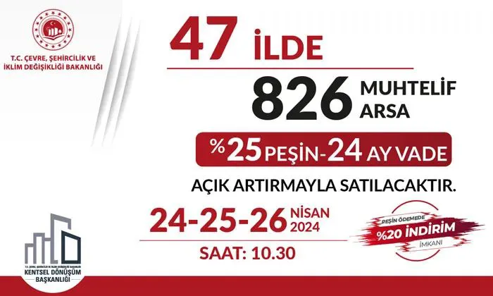 Açık artırma, 24-25-26 Nisan 2024 tarihlerinde yapılacak. İlana göre peşin ödemede yüzde 20 indirim yapılıyor. Yüzde 25 peşin ve 24 ay vade seçeneği ne sunuluyor.