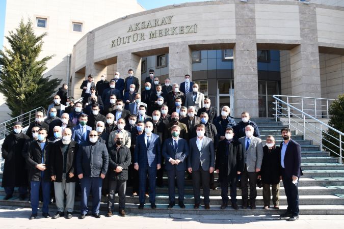 Aksaray Valiliği öncülüğünde Aksaray genelinde görev yapan din görevlilerine Covid 19 bilgilendirme toplantısı yapıldı. Toplantıya katılan Vali Hamza Aydoğdu, Belediye Başkanı Evren Dinçer ve İl Müftüsü Hasan Hüseyin Güller, din görevlilerine salgına karşı daha hassas davranmaları çağrısında bulundular.