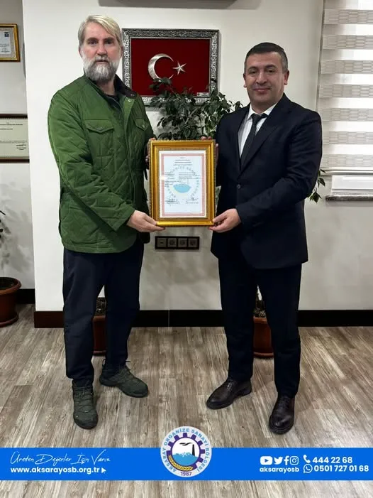 Aksaray OSB Müdürü Ali Bay, ruhsatı Dirikanlar Otomotiv Yönetim Kurulu Üyesi Emre Dirikan’a takdim etti. Ruhsat teslimi sırasında karşılıklı olarak başarı temennileri iletildi.