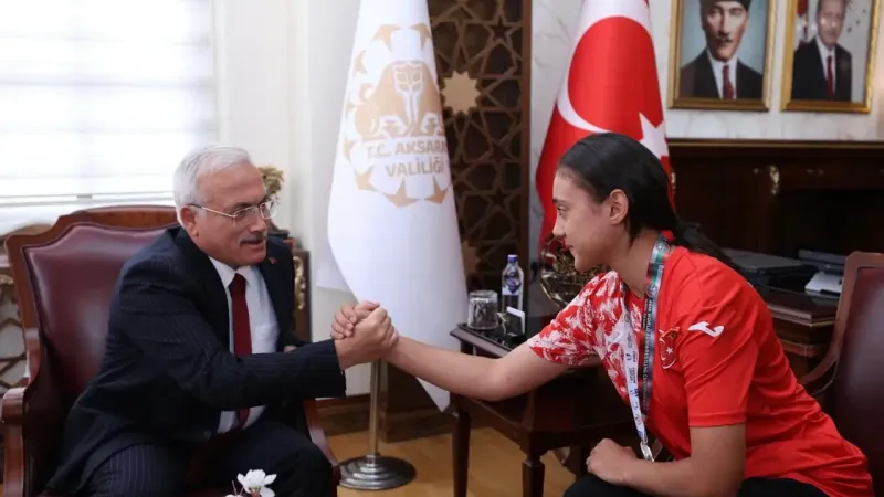 Valilik makamındaki kabulde, Gülistan Gönen'in yanı sıra Milli Eğitim Müdürü Metin Alpaslan, Gençlik ve Spor İl Müdürü Aslan Yıldız, antrenörü Günay Yılmaz ve babası Ramazan Gönen de hazır bulundu.