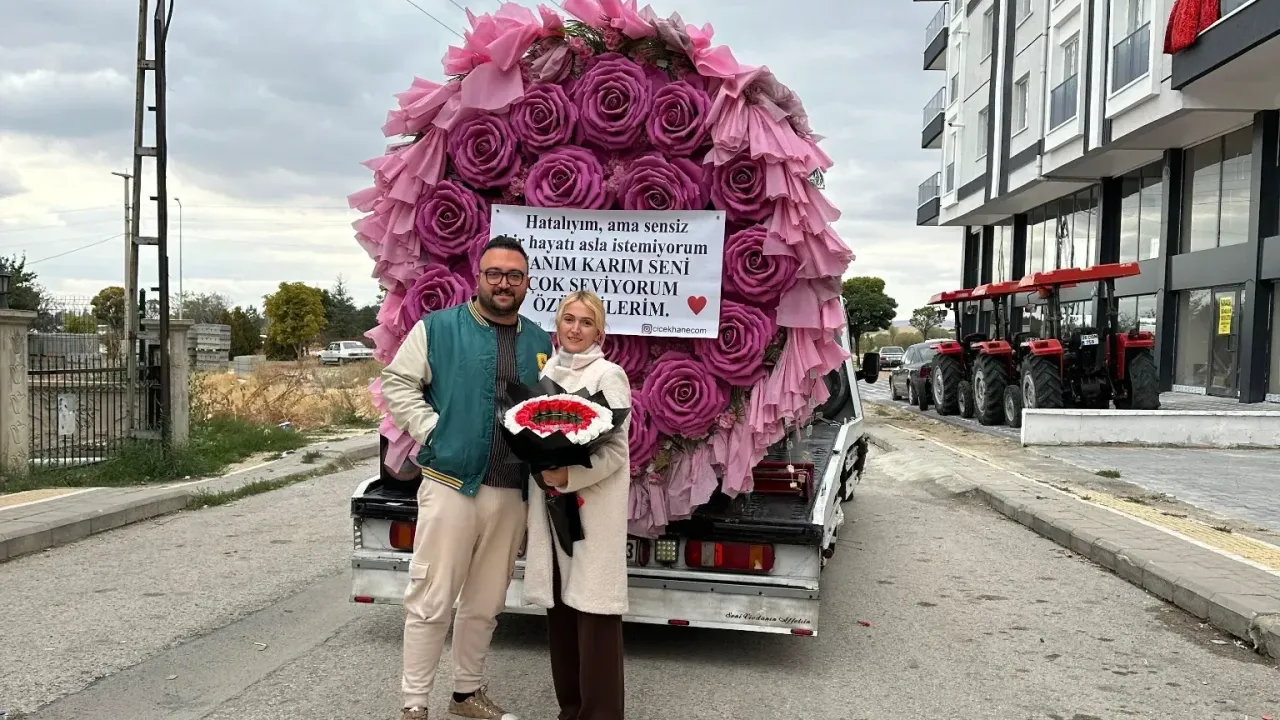 Ankara’nın Akyurt ilçesinde Taha Yasin Sevim, eşiyle yaşadığı tartışmanın ardından gönlünü almak için sıra dışı bir yönteme başvurdu. Sevim, hazırlattığı dev çiçek buketini çekiciyle eşine göndererek sosyal medyada gündeme oturdu.