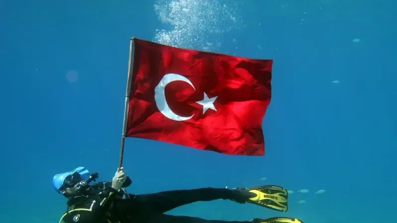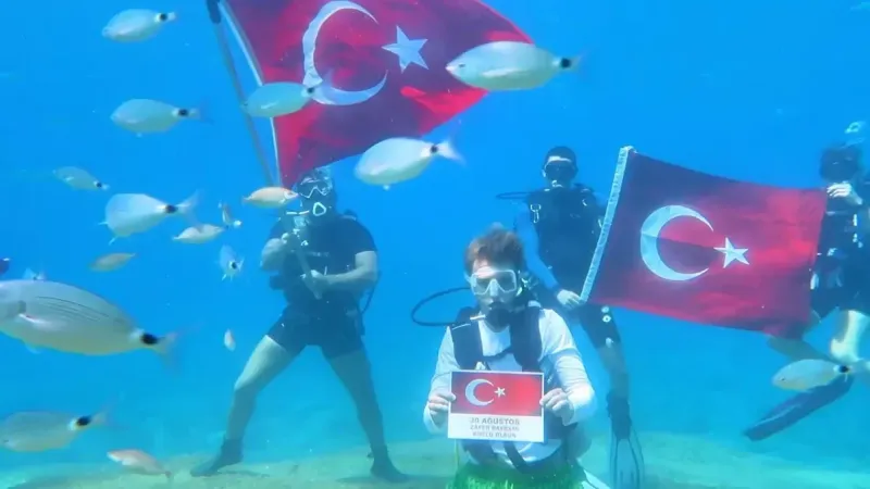 Muğla’nın Fethiye ilçesinde dalgıçlar, 30 Ağustos Zafer Bayramı dolayısıyla Dalyan Koyu’nda 8 metre derinlikte Türk bayrağı açarak kutlama yaptı. Dalgıçların deniz dibinde açtıkları bayrak, su altı kameralarıyla görüntülendi.