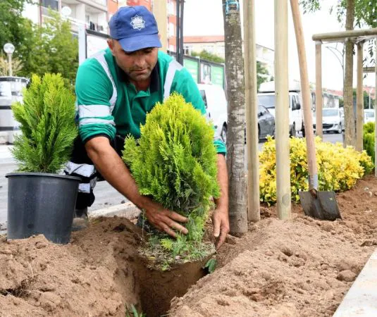 parklarda ve yeşil alanlarda yetişmiş ağaç ve fidan dikiyor. Belediye ekipleri, dikilen fidanların takibini