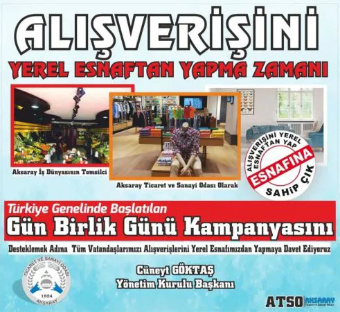 Aksaray Ticaret ve Sanayi Odası Yönetim Kurulu Başkanı Cüneyt Göktaş, 81 ilde Ticaret ve Sanayi Odaları tarafından başlatılan Gün Birlik Günü Kampanyası hakkında açıklamalarda bulundu.