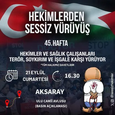 Aksaray’da, doktorlar ve sağlık çalışanları 21 Eylül Cumartesi günü terör, soykırım ve işgale karşı bir sessiz yürüyüş düzenleyecek. Sessiz Hekimler Platformu tarafından organize edilen yürüyüş, 45. hafta etkinliği olarak dikkat çekiyor.