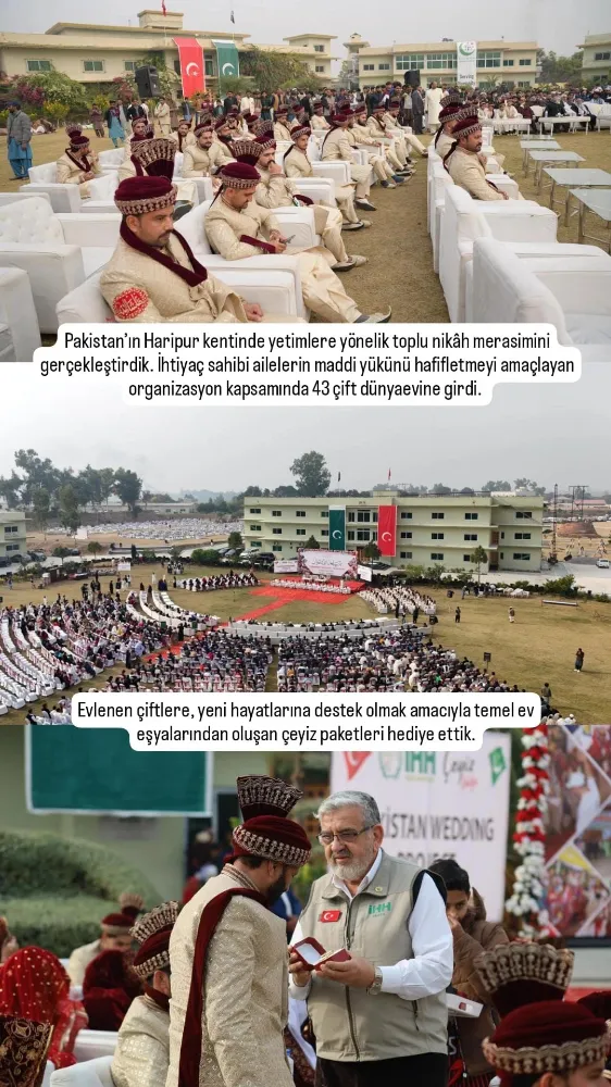 İHH Aksaray, Pakistan’ın Haripur kentinde anlamlı bir organizasyona imza atarak ihtiyaç sahibi 43 çifti toplu nikâh merasimiyle evlendirdi. Maddi imkânsızlıklar nedeniyle evlenemeyen çiftlere destek olmayı amaçlayan program, bölgedeki birçok ailenin yüzünü güldürdü.