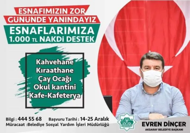 Aksaray Belediye Başkanı Evren Dinçer, koronavirüs salgını nedeniyle tedbir amaçlı iş yeri kapanan esnafa 1000 lira maddi nakdi destek yapacaklarını duyurdu. Belediye Sosyal Yardım İşleri Müdürlüğü'ne yapılacak olan başvurular 14-25 Aralık tarihlerinde alınacak. Başvuruda Vergi Levhası, işyeri Çalıştırma ruhsatı, Kimlik fotokopisi ve adınıza kayıtlı Iban numarası gösterir belge istenecek. 1 000 TL nakdi destek yardımına kahvehane, kıraathane, çay ocağı, okul kantini, kafe-kafeterya esnafları başvuru yapabilecek.
