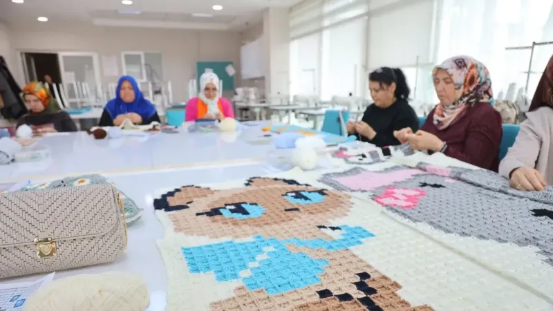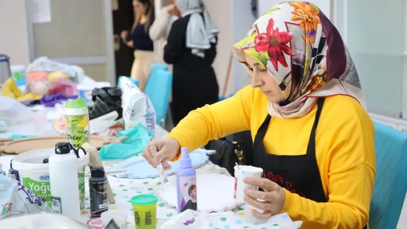 Geri dönüşüm malzemelerinin sanata dönüştürüldüğü kurslar ise çevre bilincini artırmayı hedefliyor. Kullanılmayan iplikler, kumaşlar ve plastik malzemeler, kadınların yaratıcı dokunuşlarıyla yeniden hayat buluyor.