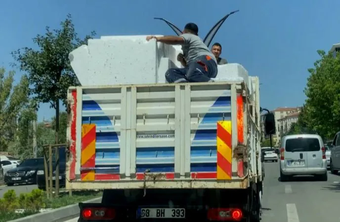 Aksaray’da yalıtım malzemesi yüklü kamyonun kasasında yalıtım malzemelerinin üzerinde trafikte seyreden 2 kişinin tehlikeli yolculuğu araç güvenlik kamerasına yansıdı.