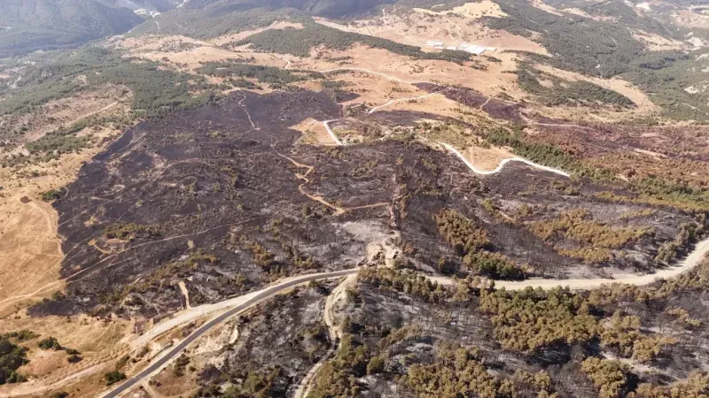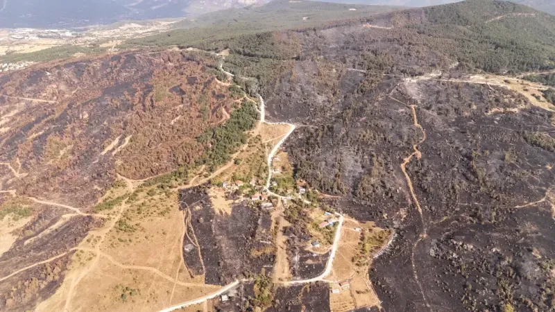 Yangının ardından bölgede büyük tahribat oluştu. Dron ile havadan çekilen görüntüler, otluk ve ormanlık alanlarda oluşan zararı gözler önüne serdi.