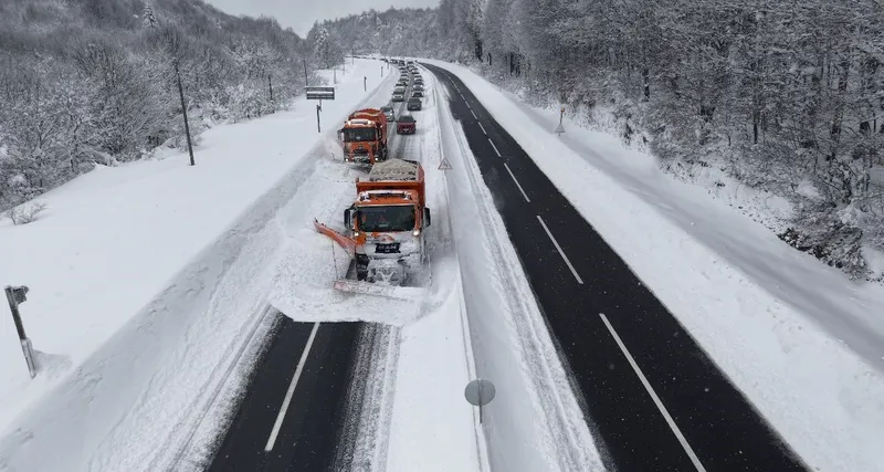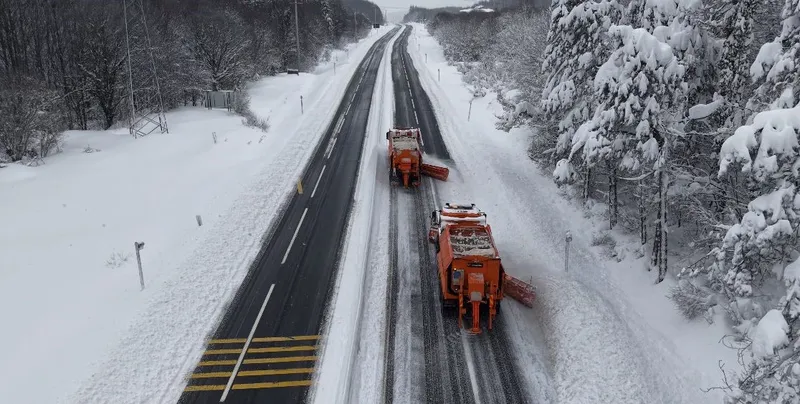 Türkiye’nin en önemli geçiş güzergahlarından D-100 karayolunun Bolu Dağı kesiminde etkili olan kar yağışı sonrası Karayolları ekipleri, yolun kapanmaması için seferber oldu. 'Kar kaplanları' olarak adlandırılan ekiplerin, beyaz örtüyle kaplanan yolu ulaşıma açık tutmak için yürüttüğü hummalı çalışma havadan görüntülendi.